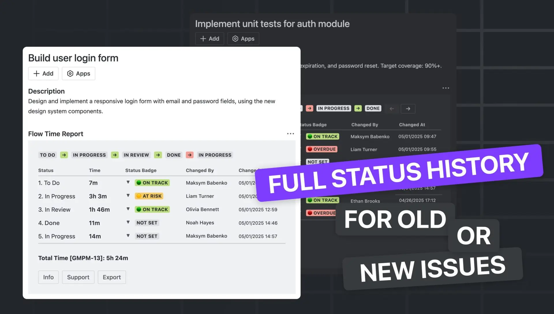 Flow Time Report visualizes time in status directly in the issue view, helping teams pinpoint delays, waiting states, and bottlenecks.