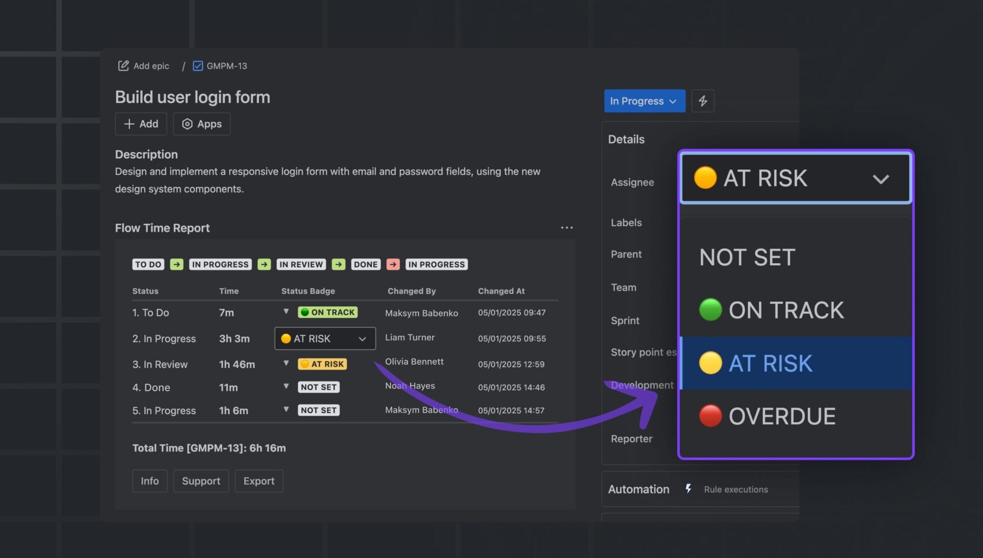 Flow Time Report visualizes time in status directly in the issue view, helping teams pinpoint delays, waiting states, and bottlenecks.