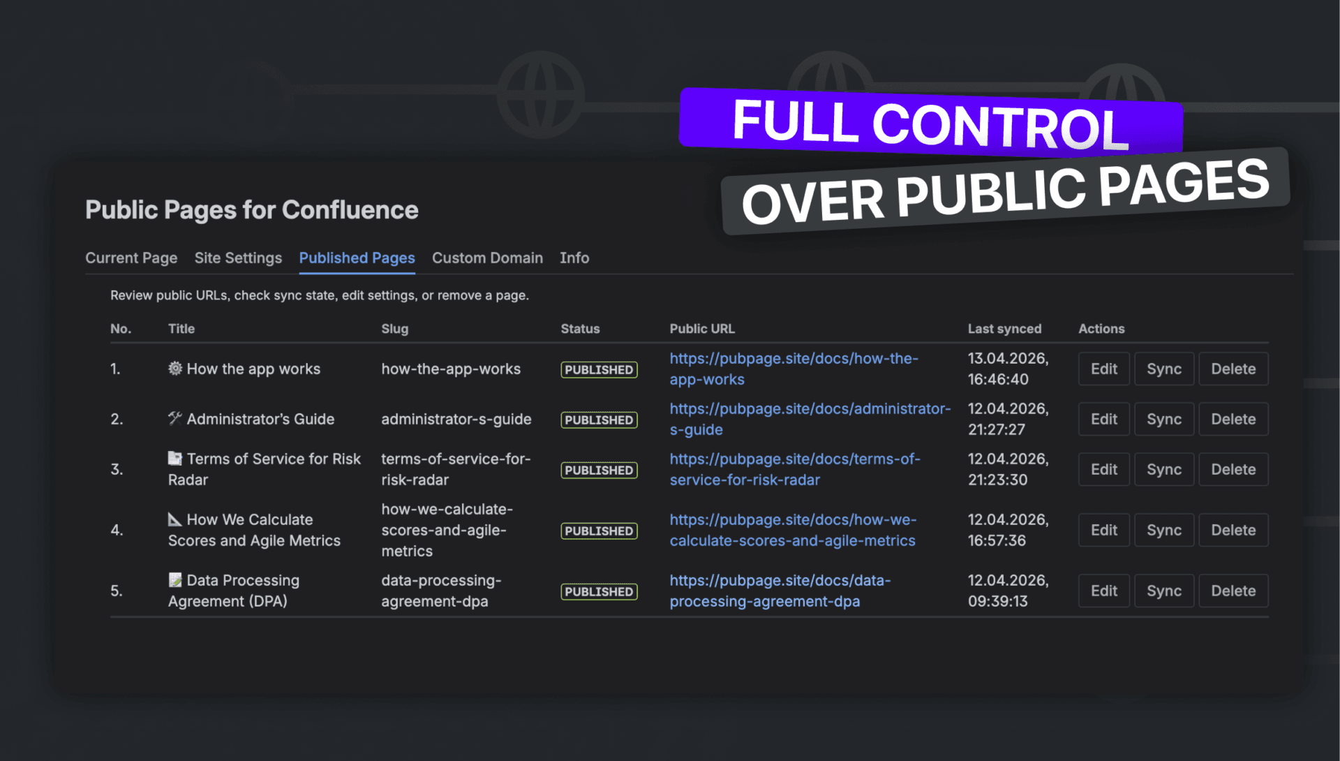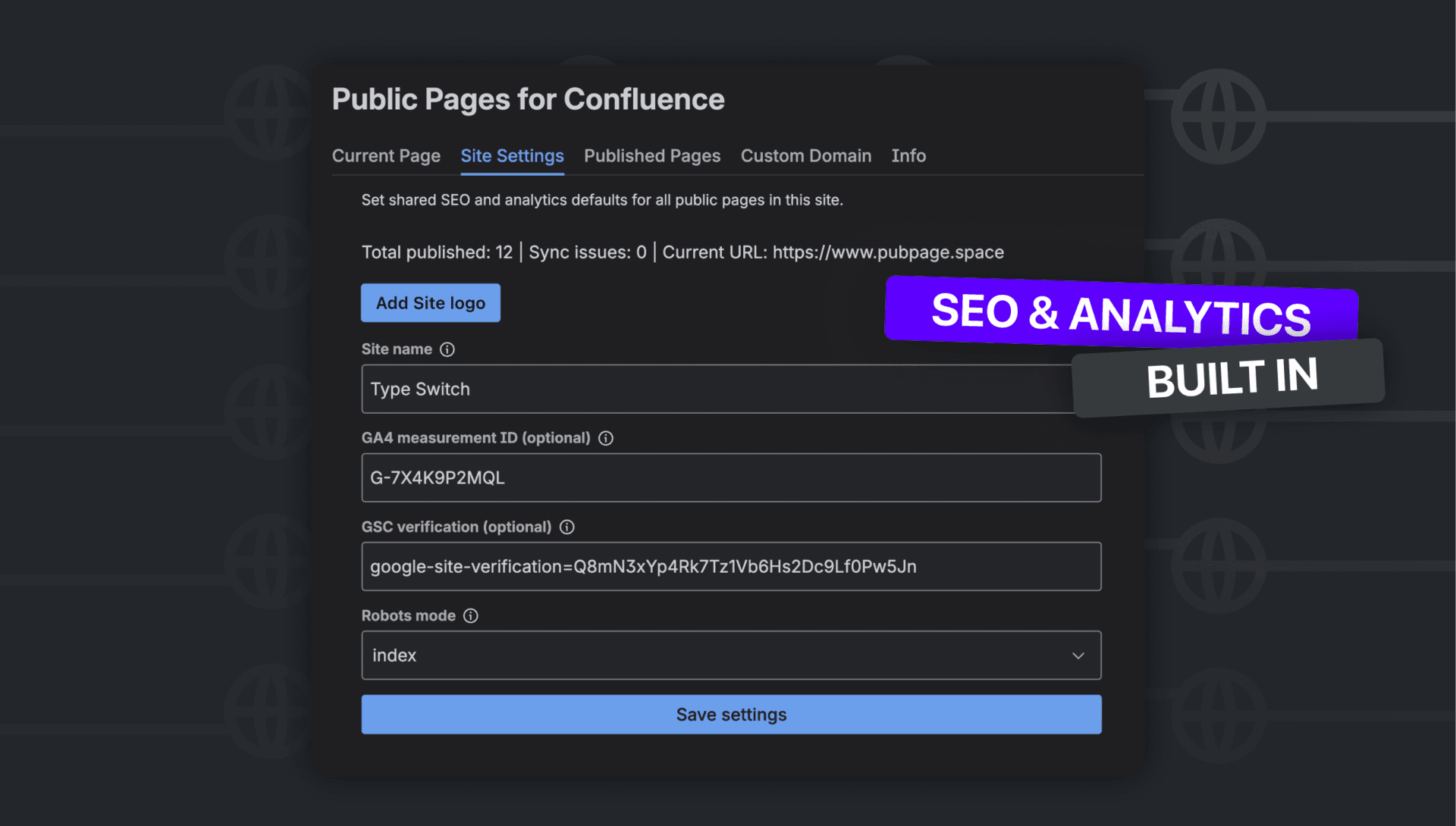 Publish Confluence pages as public websites with clean URLs, SEO metadata, branding, analytics, indexing control, and custom domains.