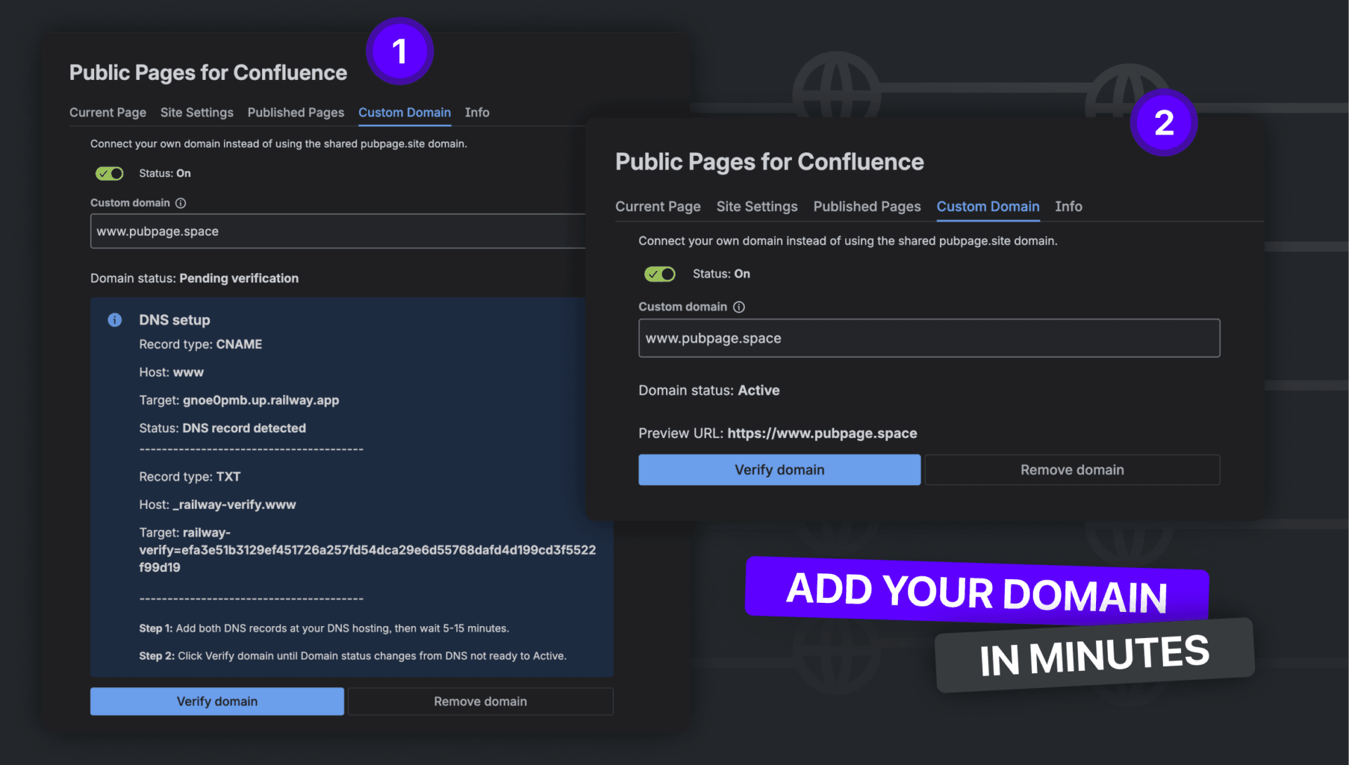 Publish documentation and other Confluence content on a branded domain instead of sending users to an Atlassian URL.