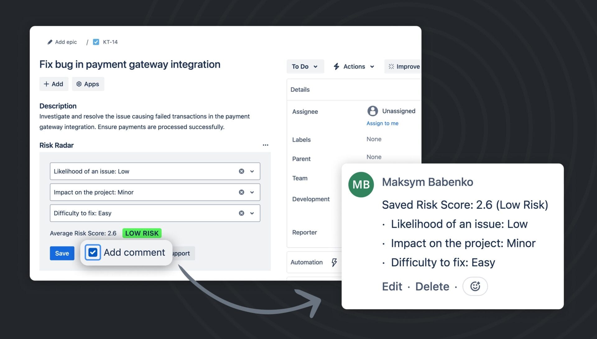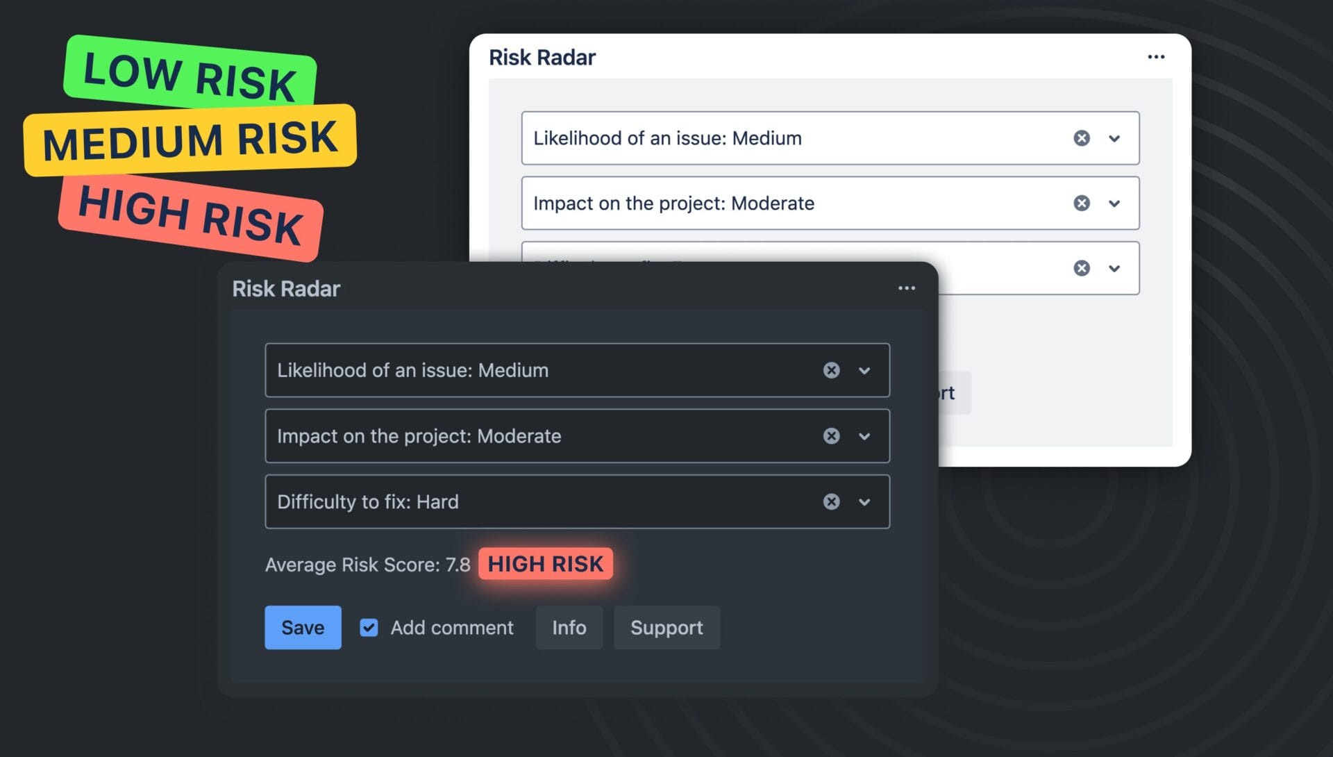 Agile teams often struggle to identify risky work early because risk tracking happens outside Jira or requires heavy project-management tools.
