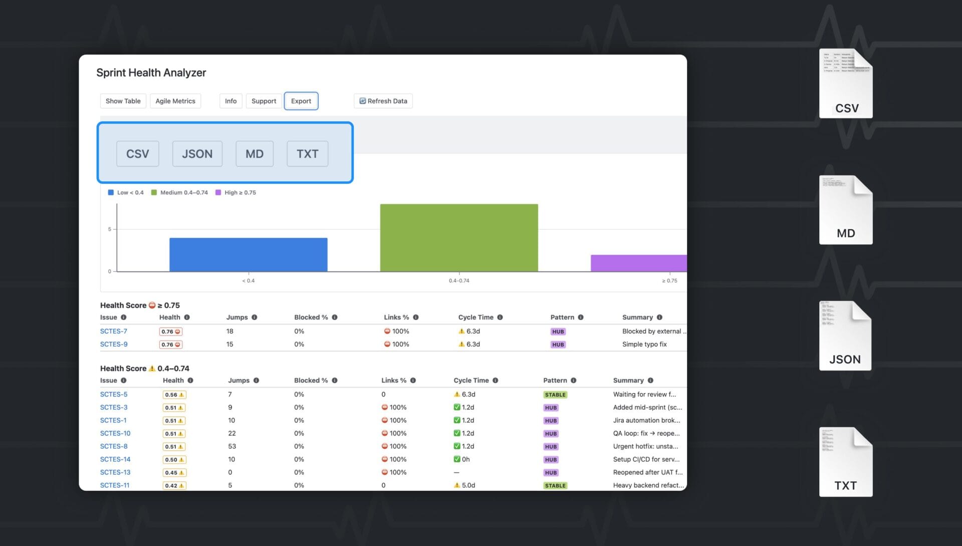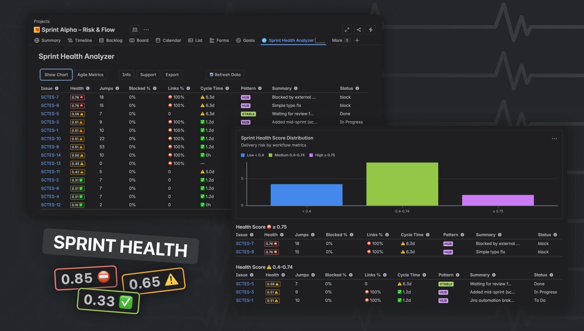 Sprint Health Analyzer brings all essential metrics into a single view inside Jira, including velocity, burndown, burnup, cycle time, blockers, and a calculated sprint health score.